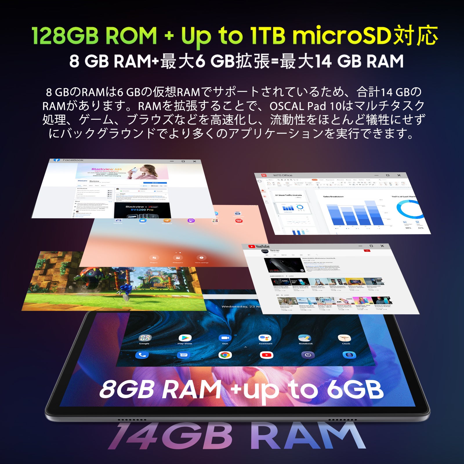 Oscal Pad 10 Android 12 タブレットは8GBの大容量を搭載し、6GB拡張することで処理速度が向上し、非常に高速でスムーズな操作体験。 128GB ROM+1TB TF拡張大容量メモリで、アプリのダウンロード時にメモリ不足を心配する必要がありません。 いつでもどこでもGoogle PlayストアからNetflix、TikTok、YouTube、LINE、Yahoo、Twitterなどのアプリをインストールでき、容量を気にせず写真やファイルを保存でき、動画、音楽、電子書籍、オンライン講座、サーフィンを楽しむことができますインターネットやゲームなどのコンテンツやエンターテイメント。