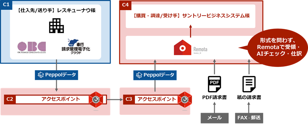今回の実証実験では、レスキューナウが『請求管理電子化クラウド』を利用してデジタルインボイスを発行し、アクセスポイントを介してサントリービジネスシステムが『Remota』にて受領確認を行いました。