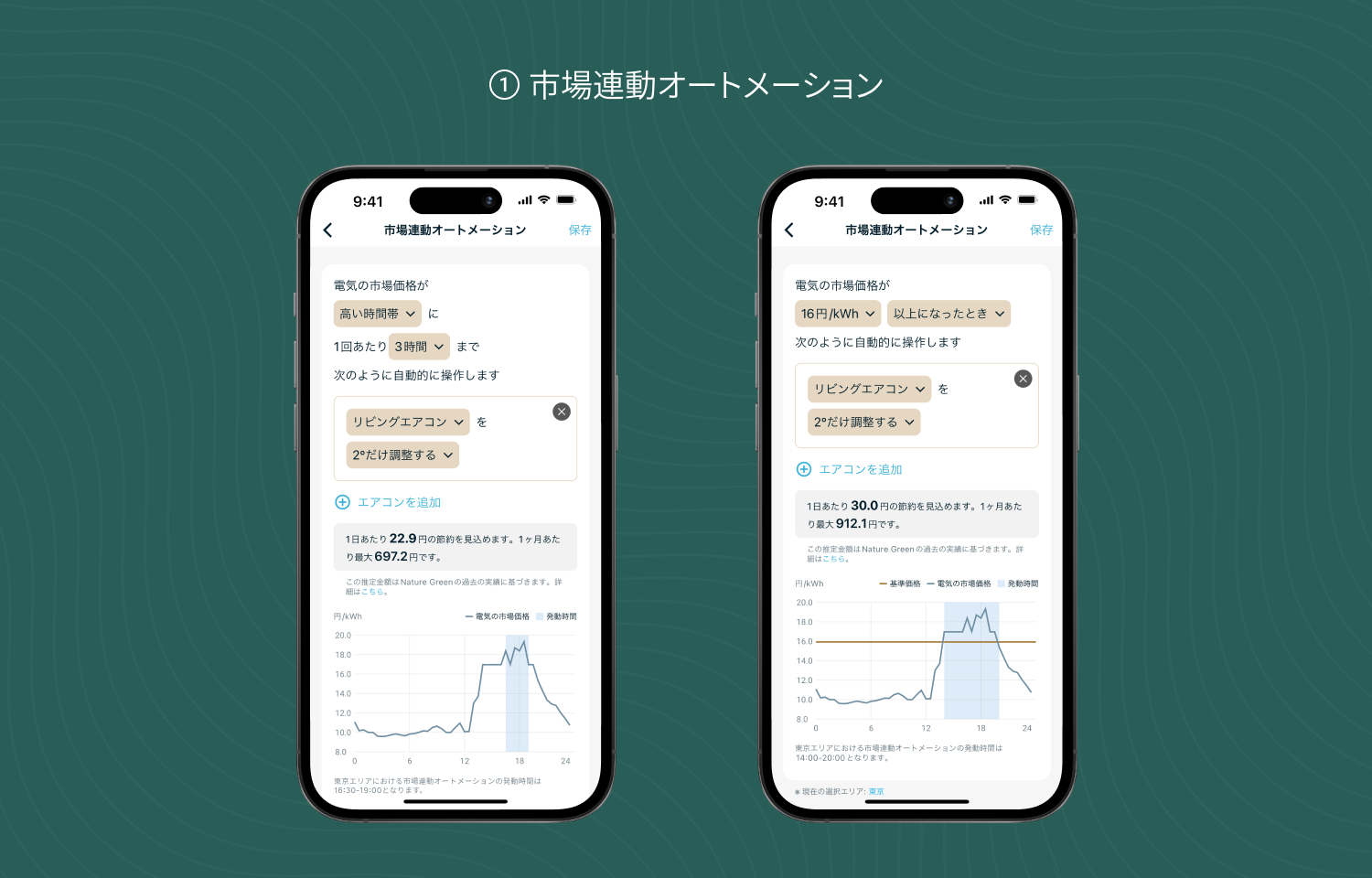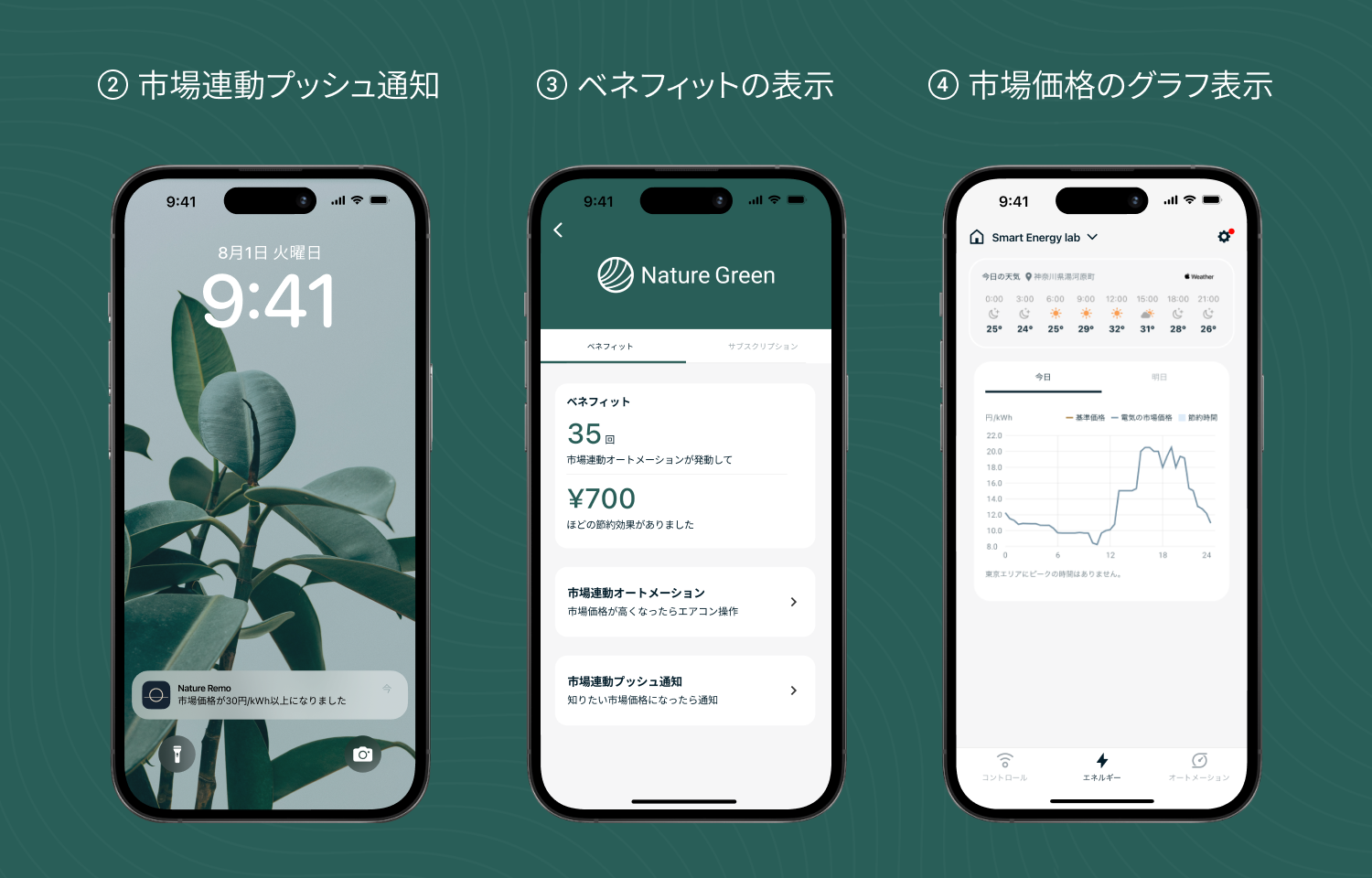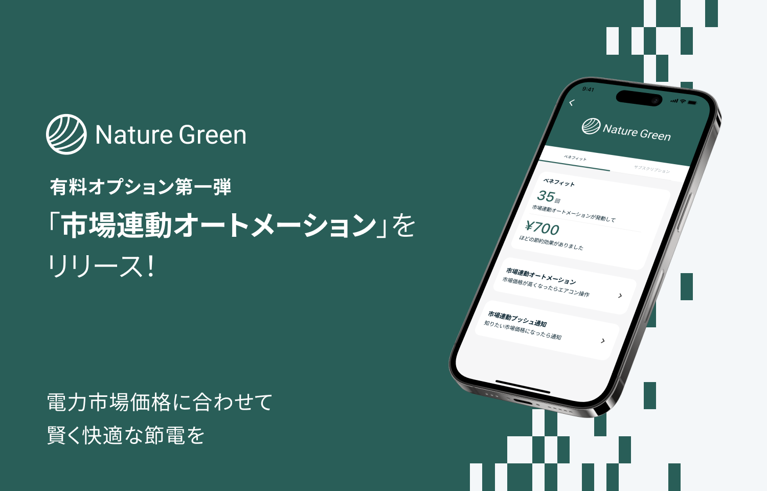 「Nature Green」は、快適性を保ちつつ、地球に優しい暮らしを実現するためのソフトウェアサービスで、「Nature Remo」シリーズ及び「Nature Remo E」シリーズの基本的な機能やエネルギーを最適にマネジメントする機能の総称です。Nature製品の基本的な機能は、従来通り無料でご利用いただけますが、今回のアップデートでは「Nature Green」の初めてとなる有料オプション「市場連動オートメーション」をリリースしました。今後も、快適さと節電のバランスをとる家電の自動制御や天気と連動したエネルギー機器の自動制御など、エネルギーを最適に使うための機能を開発・提供してまいります。