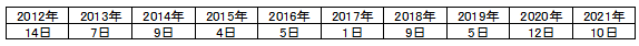 過去10年間の8月の日照時間10時間以上の日数
