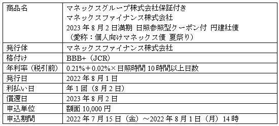 本債券は、マネックス証券の関連会社であるマネックスファイナンス株式会社が発行する円建社債で、観測期間の2022年8月2日(火)~2022年8月31日(水)の間、日照時間10時間以上となる日があるごとに年利率が0.02%上昇します。