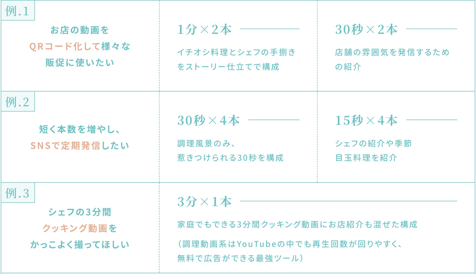 シェフ熟練の手捌きやフォトジェニックな料理をシネマさながらの動画に完成させる事で、お店の新たなファンを生み出し、優良顧客との出会いを実現させます。