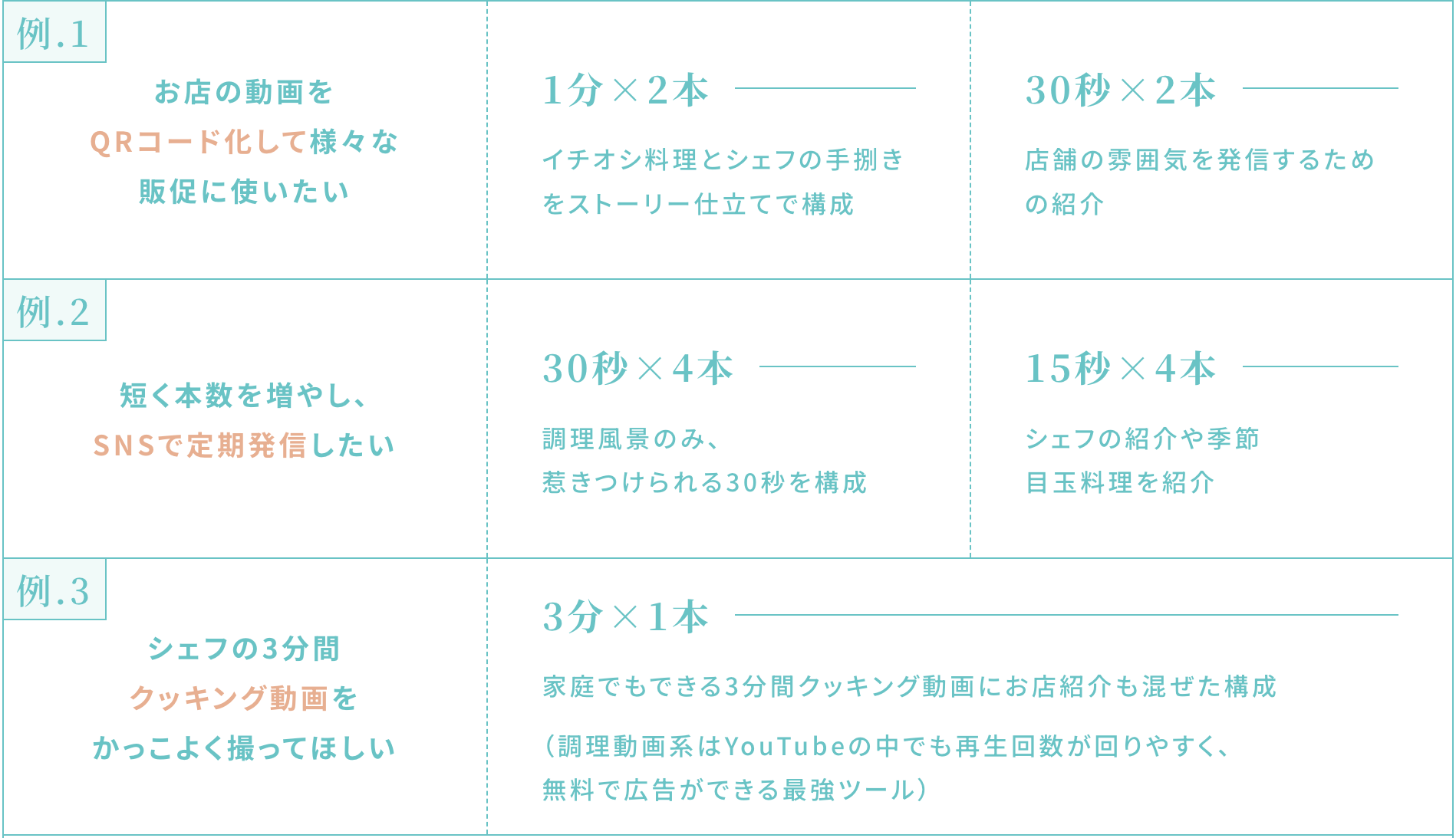 シェフ熟練の手捌きやフォトジェニックな料理をシネマさながらの動画に完成させる事で、お店の新たなファンを生み出し、優良顧客との出会いを実現させます。