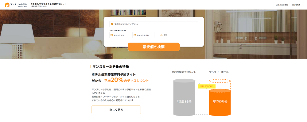 ① 7日間以上、半年までの長期予約がリーズナブルな長期滞在専門ホテル予約サイトです。サイト内には、長期利用が可能なホテルのみが掲載され、現地決済にも対応。1泊当たりの宿泊値(ADR)の最安値より20%以上割引したお得なプランを提供します。会員登録費や水光熱費など無駄な手数料もかかりません。