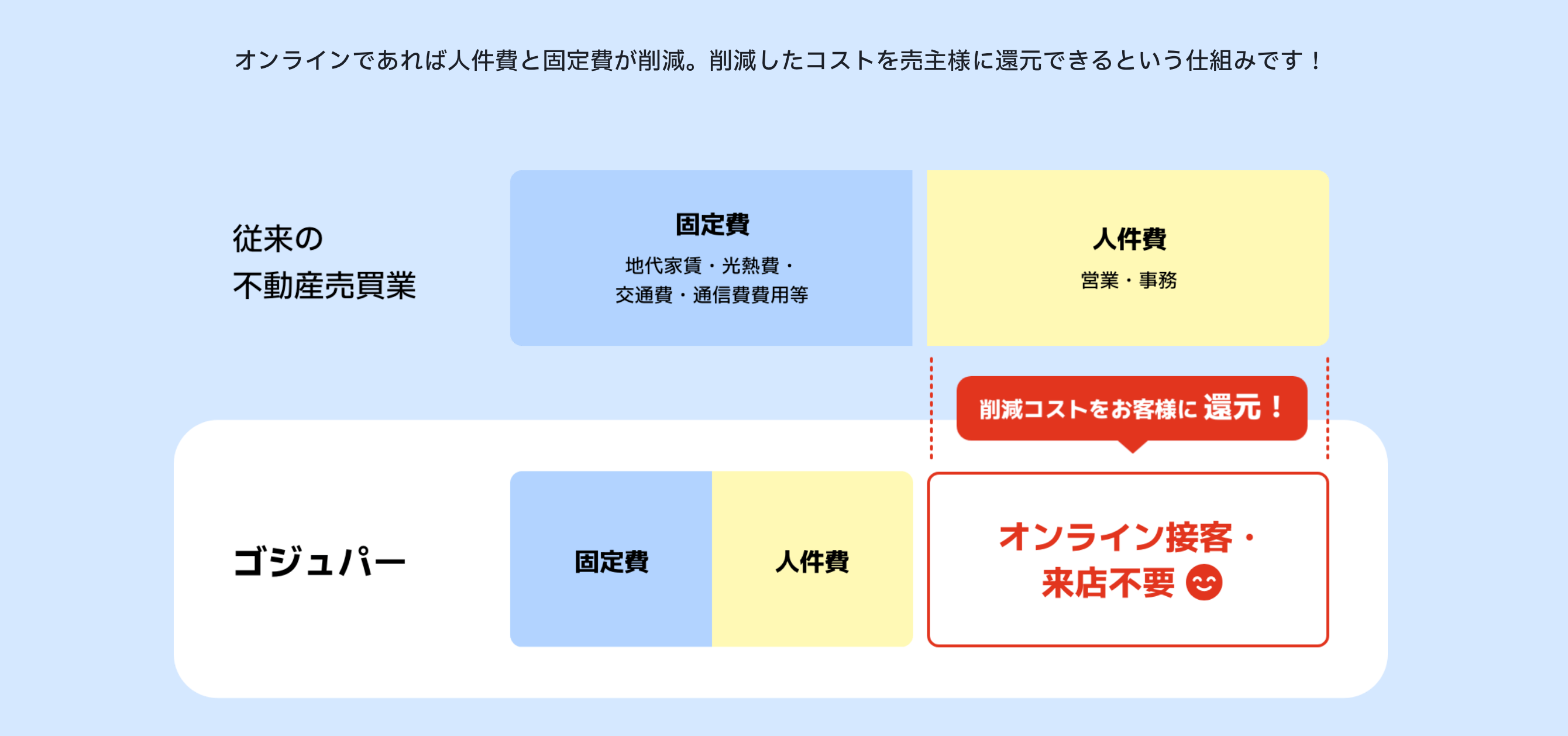 不動産取引は、店舗や現地で不動産業者の説明を受けながら進めるのが一般的です。ゴジュパーでは、不動産売買の接客や手続きをオンラインで完結することで、固定費や人件費、移動費等を抑えられることにより、仲介手数料を半分に設定します。法定で定められた仲介手数料の上限額は、物件売買金額が400万円を超える場合には「(売買価格×3%+6万円)+消費税」となります。ゴジュパーでは、その上限額を半分に設定することで、売り手と買い手の負担を軽減します。