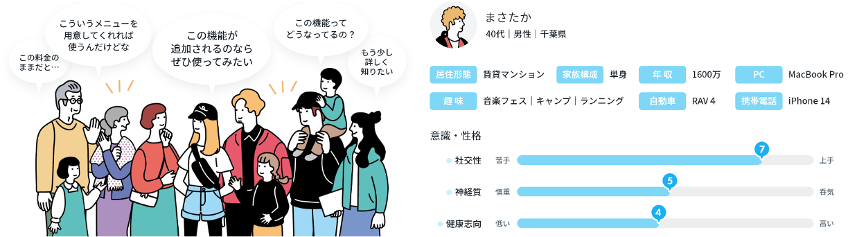 フィードバックコメントをした生活者の人物像を把握することができます。趣味嗜好やライフスタイルなどあらかじめアンケートにて取得したデータを確認することができるため、顧客像を具体化する上でのヒントを得ることが可能です。