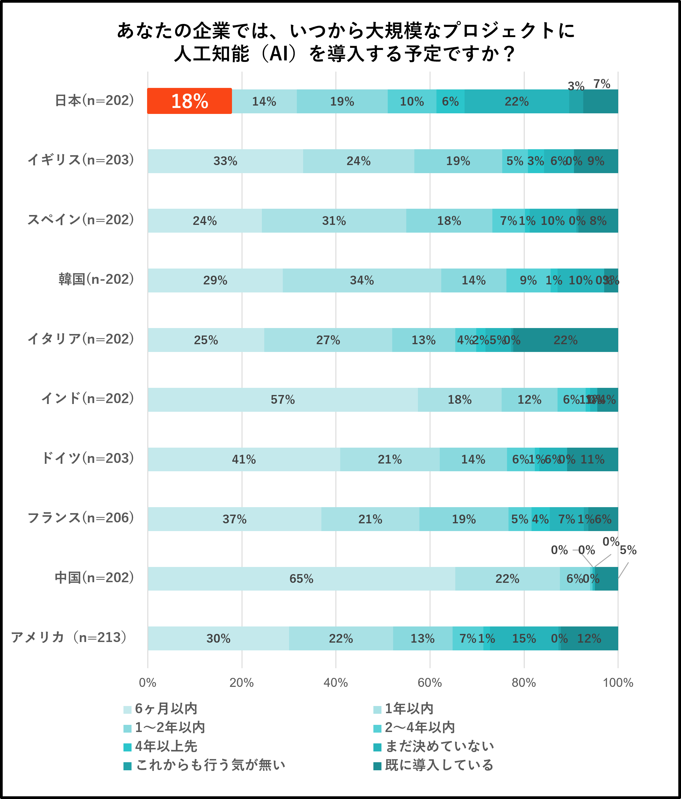 ■AIツールを1年以内に導入すると回答したのは18%。日本は世界10か国中最下位。