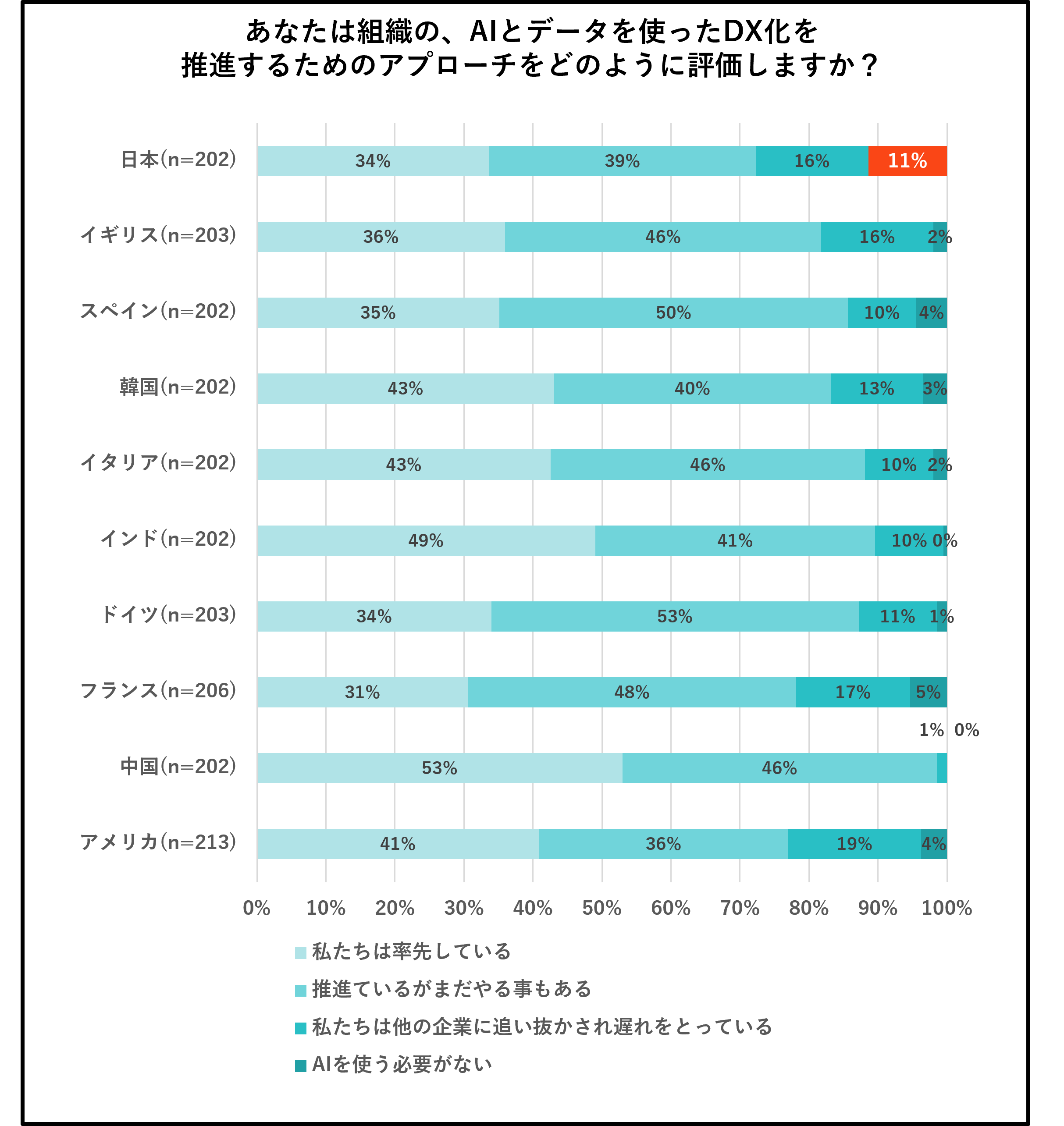 日本で「AIの導入は必要がない」と回答したのは11%になり、その他の回答国が5%以下の中、突出しています。これは世界の企業はDX化やAIの利用についても前向きだが、日本の企業では内部の人間でさえDX化やAIの利用などの重要性に気づいていないのが分かります。