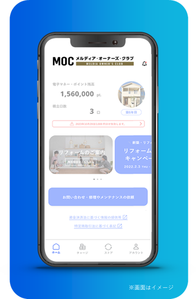 また、本アプリでシームレスに申込が可能な、リフォームやメンテナンス等にご利用いただける電子マネー「おうちポイント」を活用した「メンテナンス費用積立制度」の提供も併せて提供する予定です。