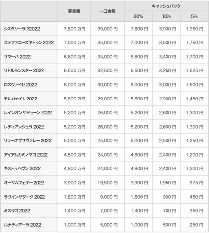 キャッシュバックの概要や募集馬ラインアップ、一口金額(※)は以下をご確認ください。