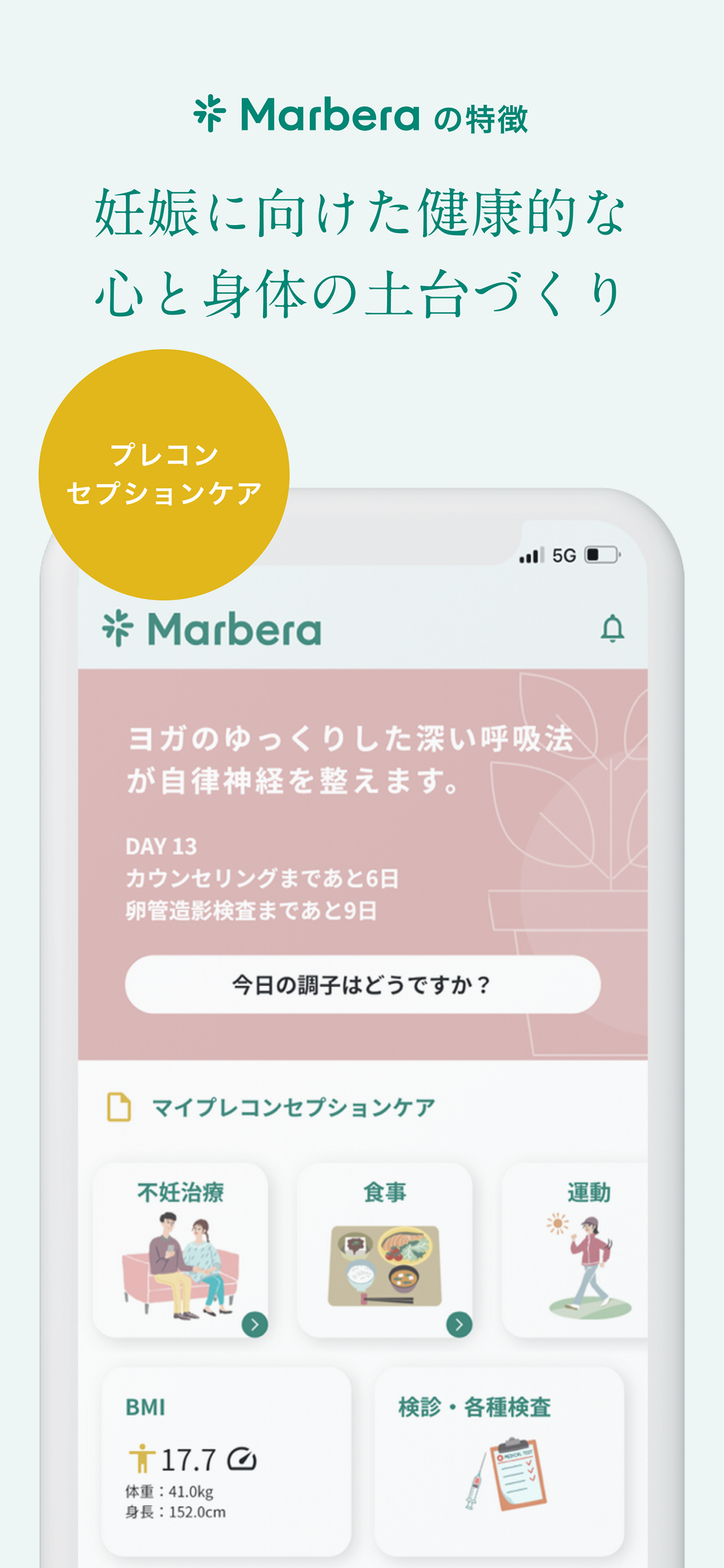 私たちMarbera(マーベラ)は、この課題を解決するため、アプリを通じてプレコンセプションケアを提供し、妊娠を目指す過程で持続的に健康的な生活習慣を獲得することを支援します。その中には心のケアも含まれています。