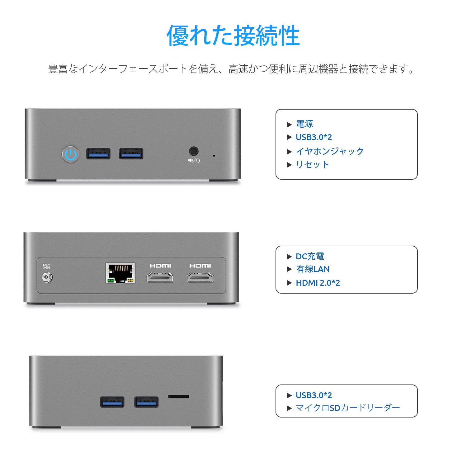 4K UHDの高精細画面:BMAX B3は、インテル UHD Graphics 750 GPUを搭載しており、超リアルな4K UHDビジュアルに対応しています。また、HDMI*2接続を介して最大2画面同時出力。802.11 b / g / n / ac、2.4 + 5G Wi-Fi、1000M LANをサポートし、ネットの高速とパフォーマンスを保証します。
