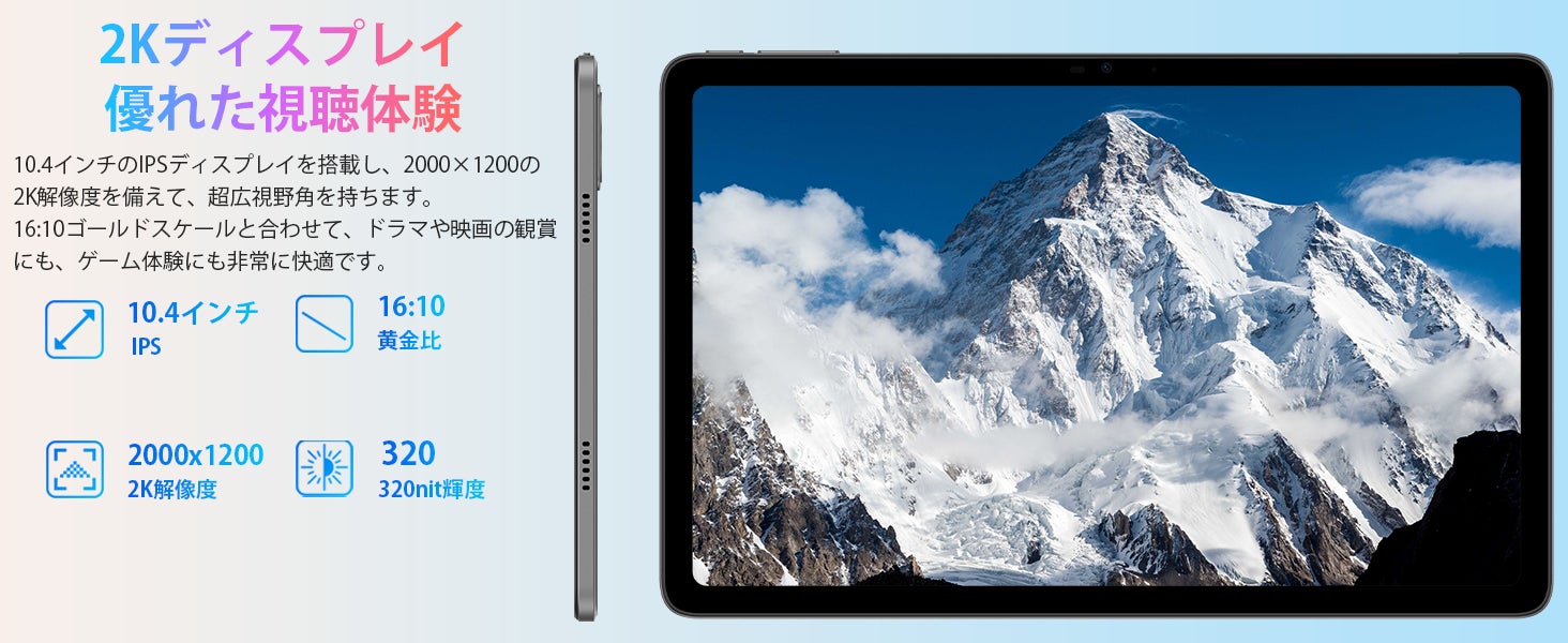 DOOGEE T20 android タブレット 新型 は10.4インチ2000*1200解像度2K全視野角スクリーンで、ピクセル密度が高いため、より細部まで描写でき、よりシャープで鮮明な画像が得られます。