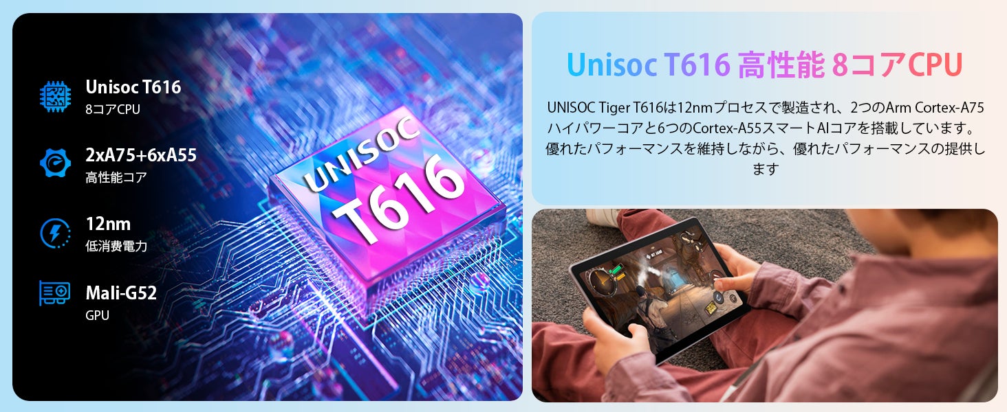 DOOGEE T20 タブレット 10インチ wi-fiモデルは12nmプロセスの8コアUNISOC T616高速プロセッサーを搭載し、A75アーキテクチャーのコアを採用、最大2.0Ghzの周波数をサポートする。 強力なMali G57ゲーミンググレードグラフィックスプロセッサーを搭載し、日々のエンターテインメント用途の需要に応えることができる。
