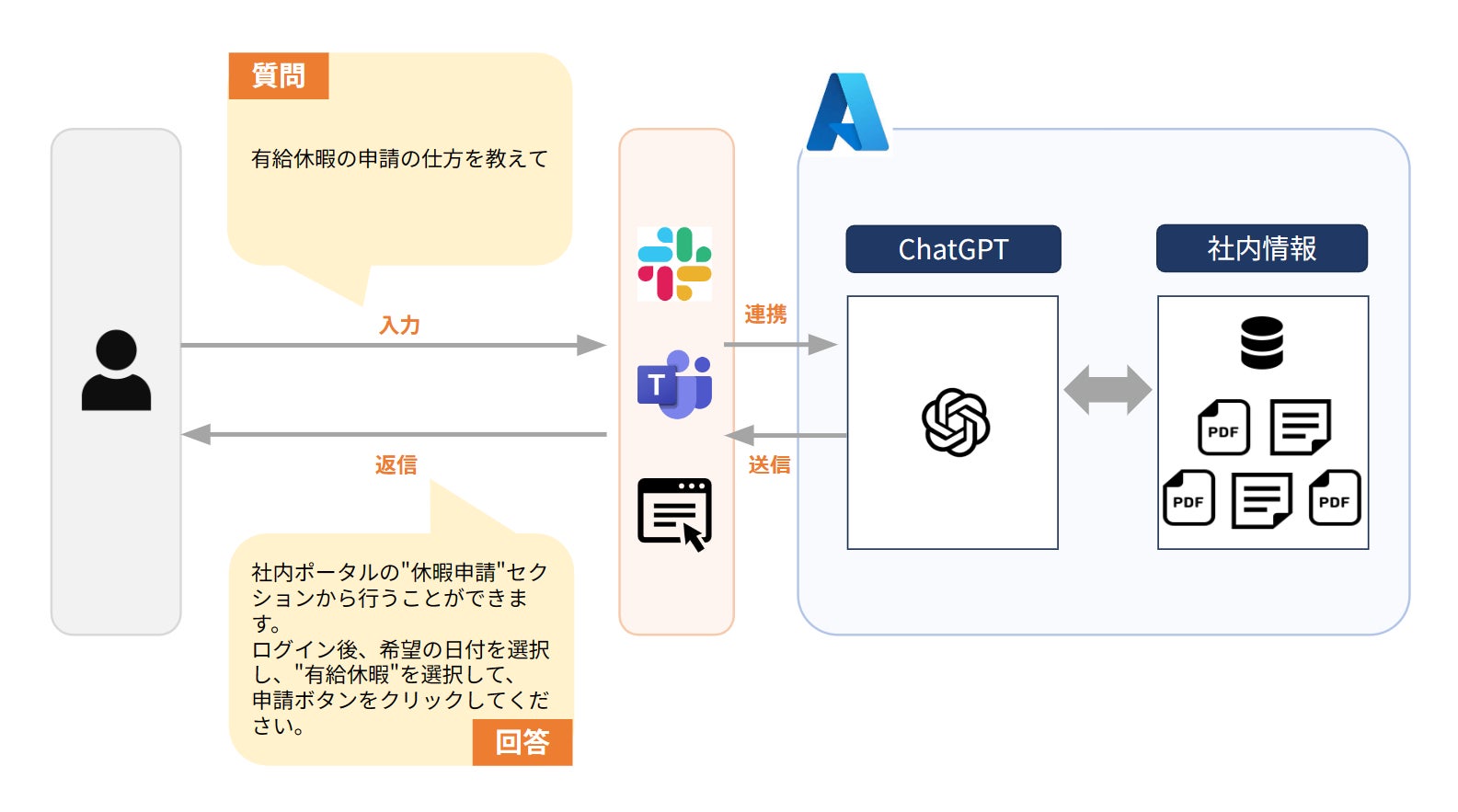 文章生成、思考支援、社内手続きの問い合せ対応(チャットボット)、議事録作成など多岐にわたる業務プロセスにおいて、生成AIの活用が期待されています。また、情報漏洩などセキュリティリスクを考慮し、Azure OpenAI Serviceを利用した高いセキュリティ対策が施された環境にてChatGPTの運用が可能であることも本サービス導入の要因となりました。