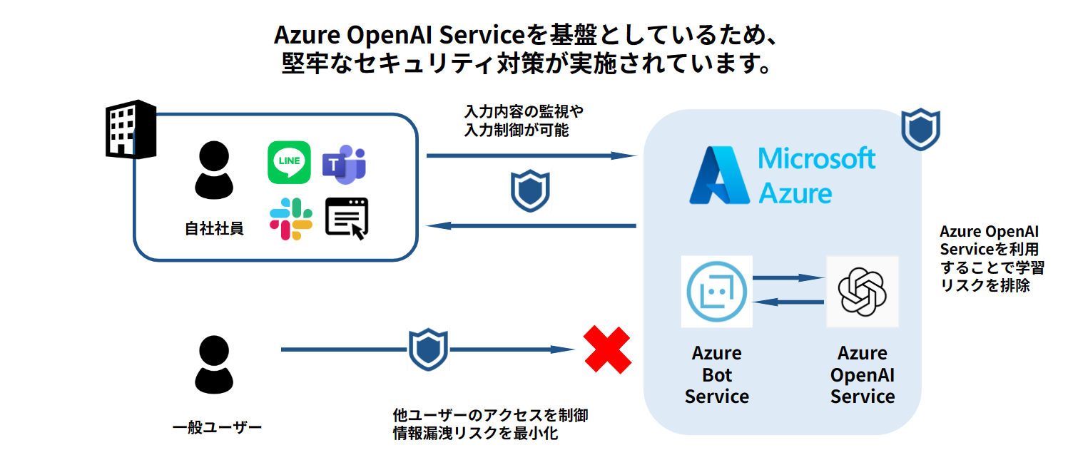 「AIフォワードハブ powered by ChatGPT」は、Azure OpenAI Serviceを基盤とした堅牢なセキュリティ対策が施された環境で安心してご利用いただけます。パブリックなChatGPTと異なり、入力される内容が学習用データとして取り込まれたり社外に情報漏洩することはありません。これにより、企業の独自データや機密情報を安全に扱うことが可能となります。
