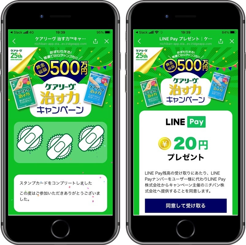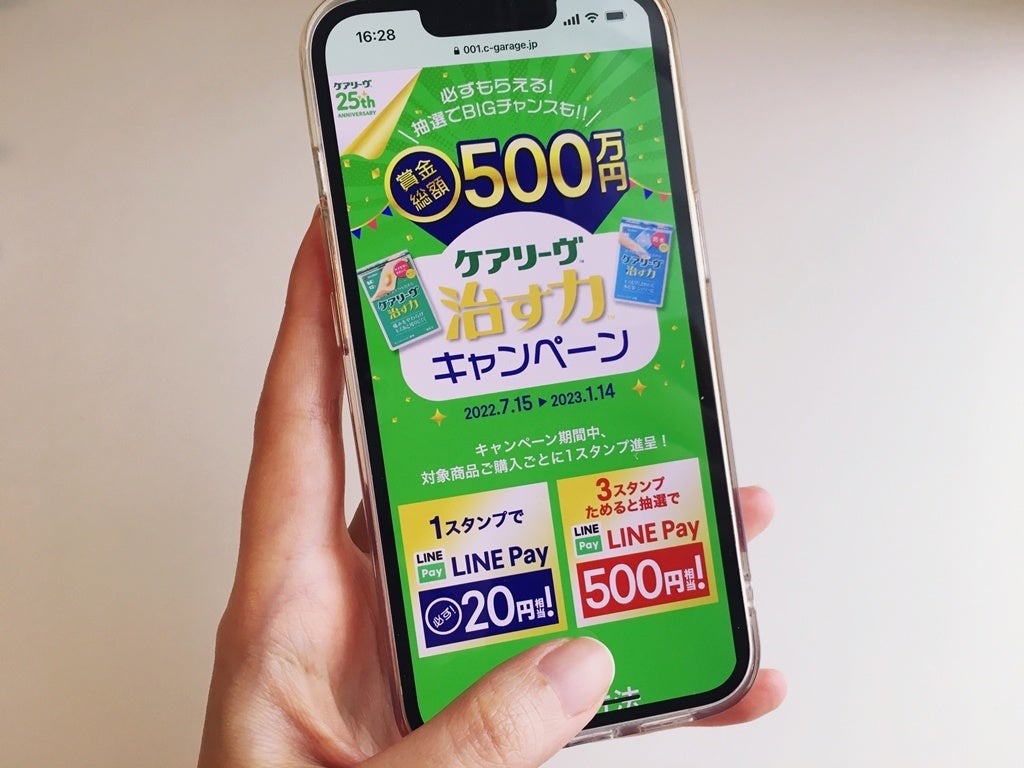 「賞金総額500万円 ケアリーヴ™治す力™ キャンペーン」は、「ケアリーヴ™治す力™」の対象商品バーコードと購入レシート読み取りでスタンプがたまり、1スタンプごとに20円分のLINE Pay残高が必ずもらえる、LINEミニアプリを活用したキャンペーンです。スタンプはお一人様につき3つまでためることができ、3つためると抽選で500円相当のLINE Pay残高がもらえるダブルチャンスも用意しています。