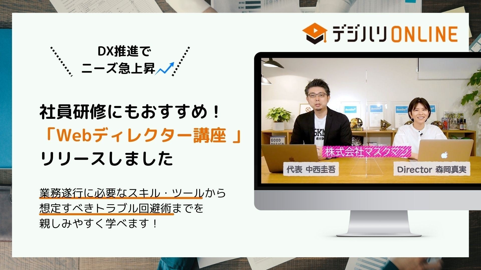 そこでデジハリ・オンラインスクールは、国内外で多数の受賞歴、優れたクリエイティブを産み出すデジタルインタラクティブ企業「株式会社マスクマン」の協力を得て、より実践的で学びのある「Webディレクター講座」をリリースするに至りました。