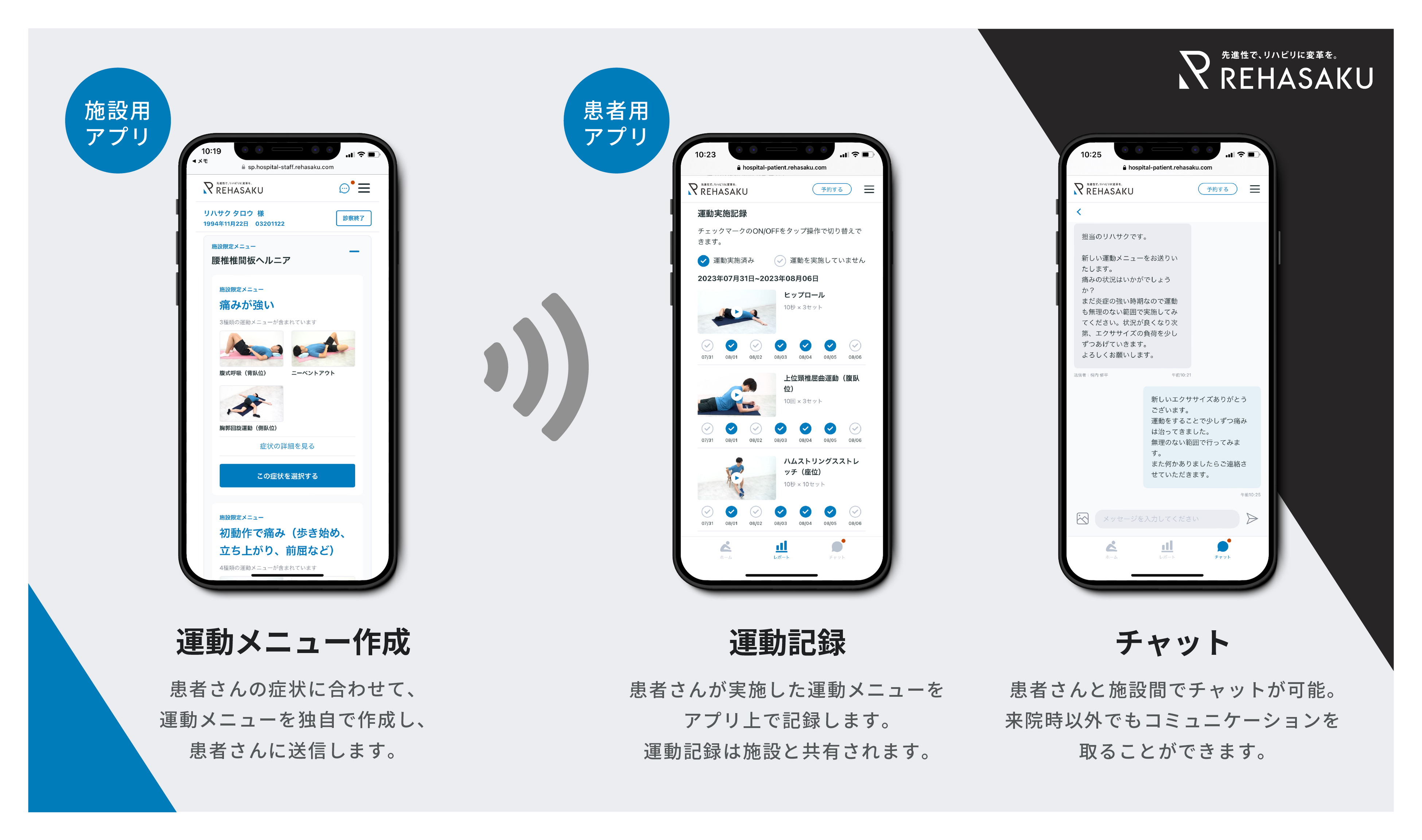 当社は接骨院や整体院などの治療院現場と、病院や整形外科クリニックなどのリハビリ現場で使用いただく「運動療法クラウドシステム リハサク」を提供しています。当社がプロダクトの強みとして提供している運動療法は、エビデンスが確立され、様々な疾患に対して効果的な治療法と位置付けられています。しかし、治療院や病院などへ通う患者さんの多くは、運動療法の重要性を理解しておらず習慣化されにくいという課題があります。そこで当社は、理学療法士や柔道整復師(以下、セラピスト)が、担当している患者さんに対して適切な運動療法を指導できるようなサポートを、クラウドサービスを提供することで行っています。そして、アプリを通じてセラピストが患者さんへ運動療法を提供することで、運動の習慣化を支援するサービスを展開しています。
