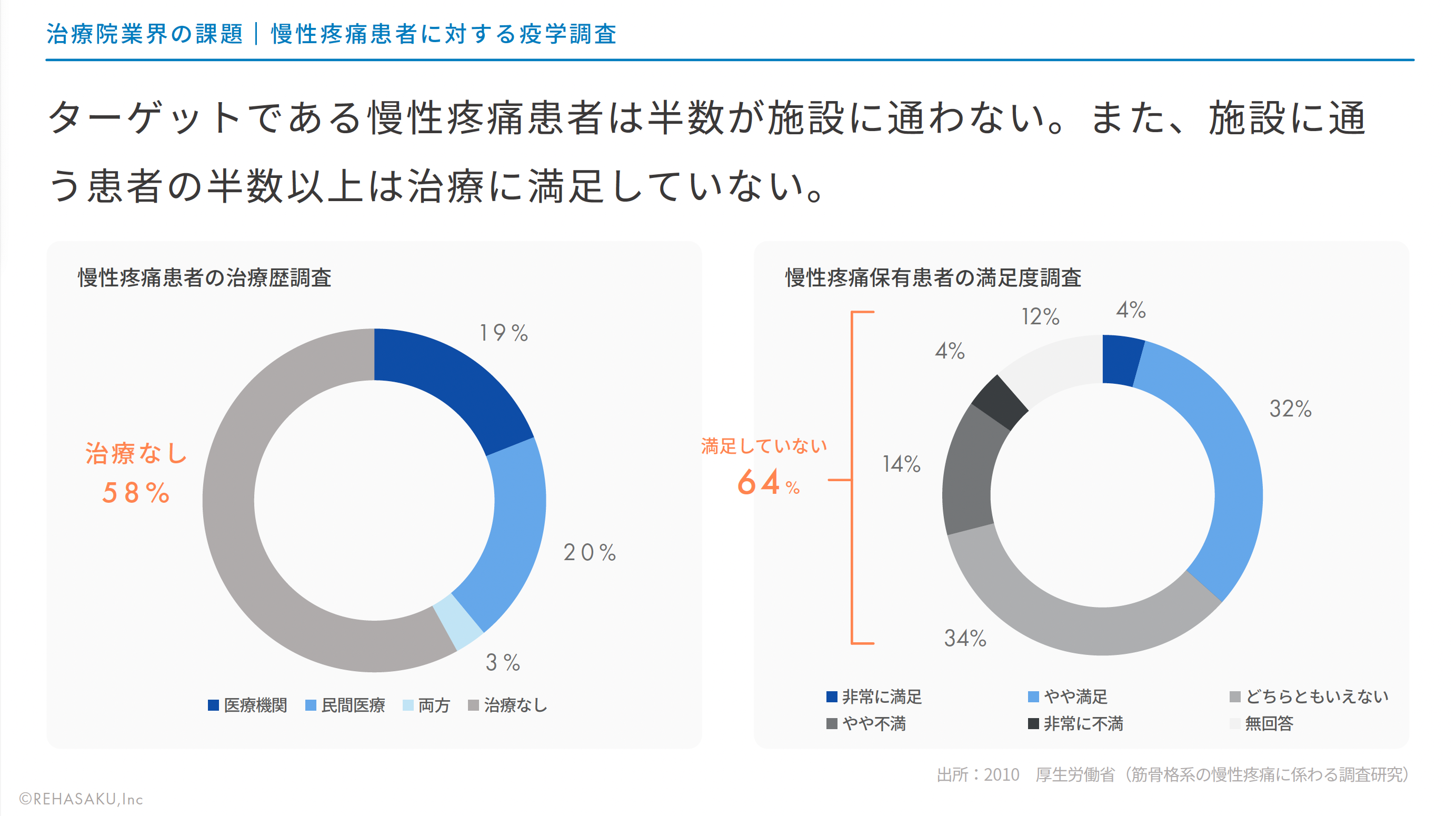 また治療院に通う患者に目を向けると、患者は思ったような情報を得られず「原因が分からないまま治らない」課題に直面するケースもあります。医療機関や治療院に通う腰痛、肩こり、関節痛などの慢性疼痛疾患においては、約7割もの患者が1年以上の治療歴を有しているにもかかわらず、十分な治療効果が得られていないことが明らかとなっています。