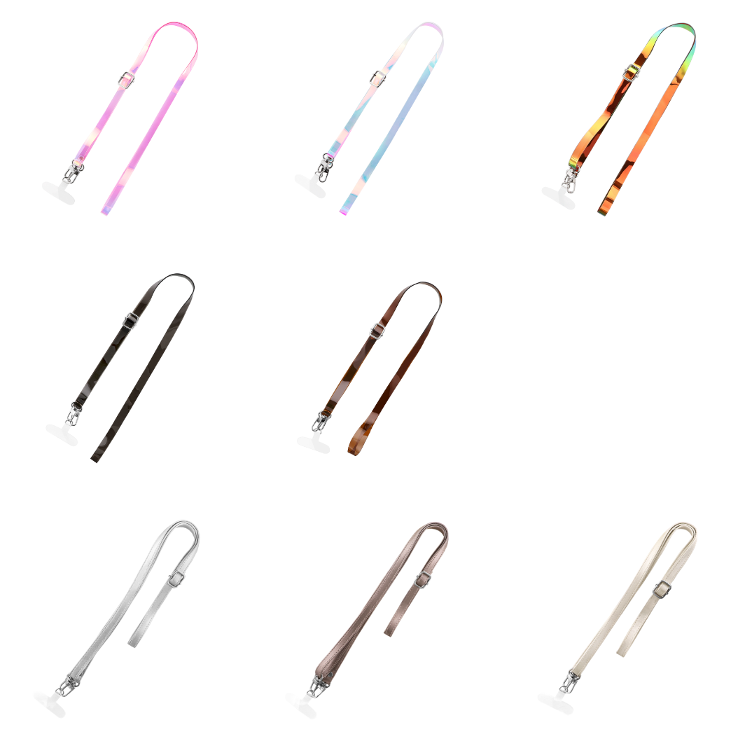 光の当たる角度によってカラーが変わって見えるオーロラカラータイプ。長さ調節可能アジャスター付き。フック付きケースに対応可能。キラッと光るストラップはコーデのアクセントにも。表情の異なる3色展開。
