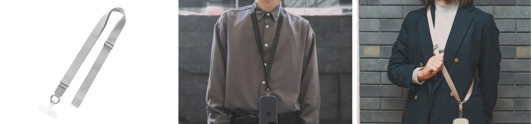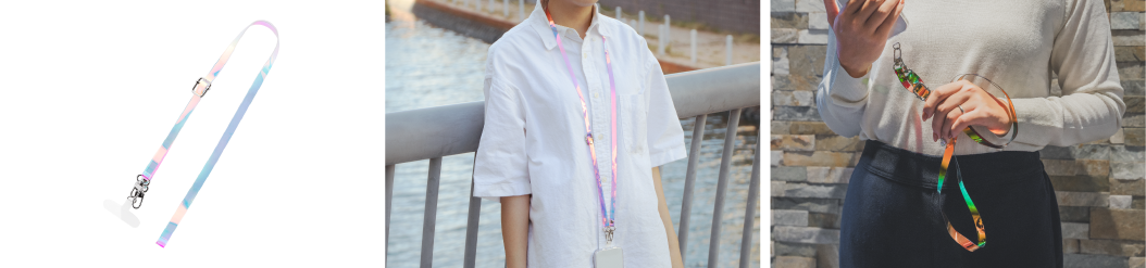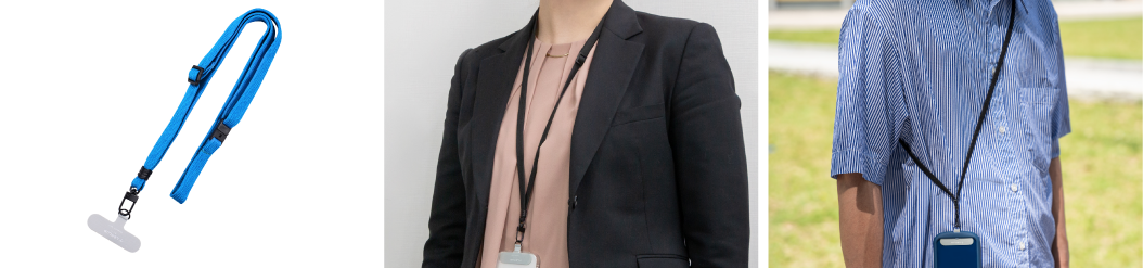 どんな場面でも使いやすいシンプルなデザインの平紐タイプ。長さ調節可能アジャスター付きのため、ビジネスシーンにも最適な長さ(最短40cm) にも調整できます。緊急時に外れる安全機構を備えており、小さなお子様でも安心して使用することができます。