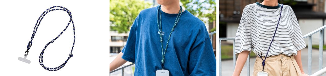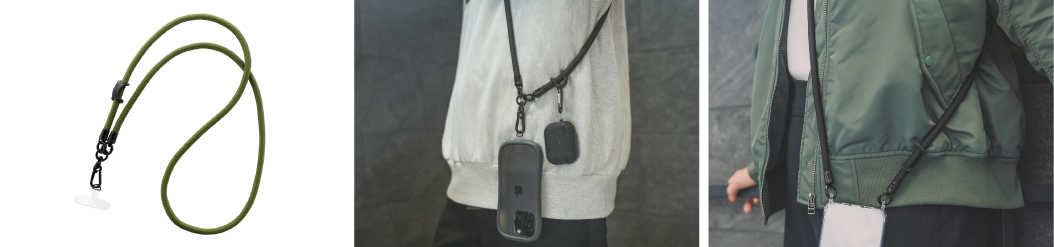 首や肩が痛くなりにくい安定感のある太丸紐タイプ。フック付きケースに対応可能。レザーパーツにAirPods など小物を取り付けられます。アウトドアでも馴染む3色展開。