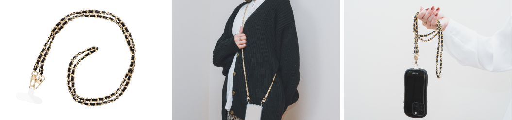 平紐レザーに高級感あふれるゴールドチェーンを編み込んだ編み込みチェーンタイプ。フック付きケースに対応可能。肩への負担を考えた軽量チェーンを使用しています。コーデに合わせやすい3色展開。