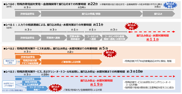 従来の人力での相談連絡による振り込み防止・水際対策時間(レベル1)は約11分であったが、ICT(特殊詐欺対策サービス、シン・オートコール)を活用した振り込み防止・水際対策時間(レベル3)は約19分確保することができ、地域と連動した広域みまもりにつなげられることを確認できた。