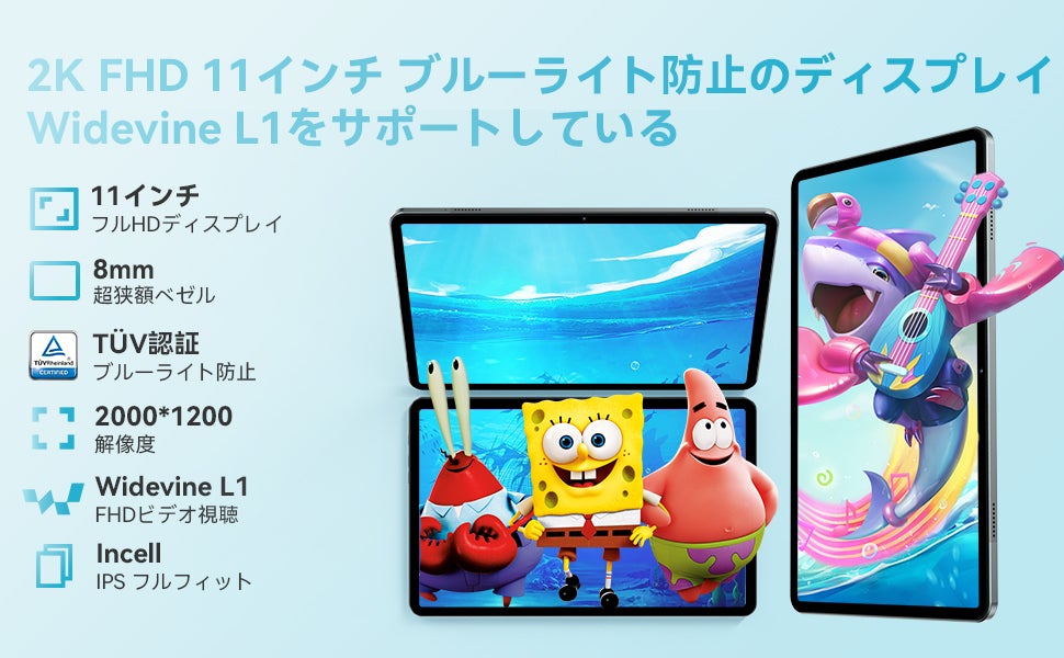 11インチ|新しいAndroid 13|2Kディスプレイ|T616オクタコアチップ|ワイドビンL1 |16GB+256GB|2000*1200|ラインTÜVアイケア認証|前800W、後2000W