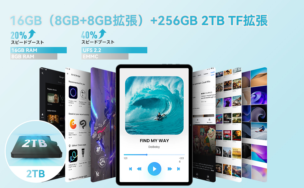 Hpad2 Proは8GB + 8GBのメモリ構造を採用しており、デバイスに組み込まれた8GBのランニングメモリがあります。フルロード時には、8GBのメモリをスマートにデバイスの実行に割り当て、実行速度が20%向上します。256GBのUFS 2.2フラッシュストレージ技術とaWriteBooster書き込み加速技術を採用し、通常のeMMCストレージよりも読み書き速度が40%高速です。256GBの大容量ストレージに加えて、最大2TBのTFカード拡張もサポートしており、ビデオの録画、写真撮影、ゲームのダウンロード、映画のダウンロードなどを自由に行うことができます。最低でも1年間は心配することなく使用できます。