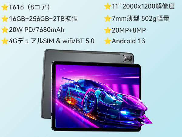 11インチ|新しいAndroid 13|2Kディスプレイ|T616オクタコアチップ|ワイドビンL1 |16GB+256GB|2000*1200|ラインTÜVアイケア認証|前800W、後2000W