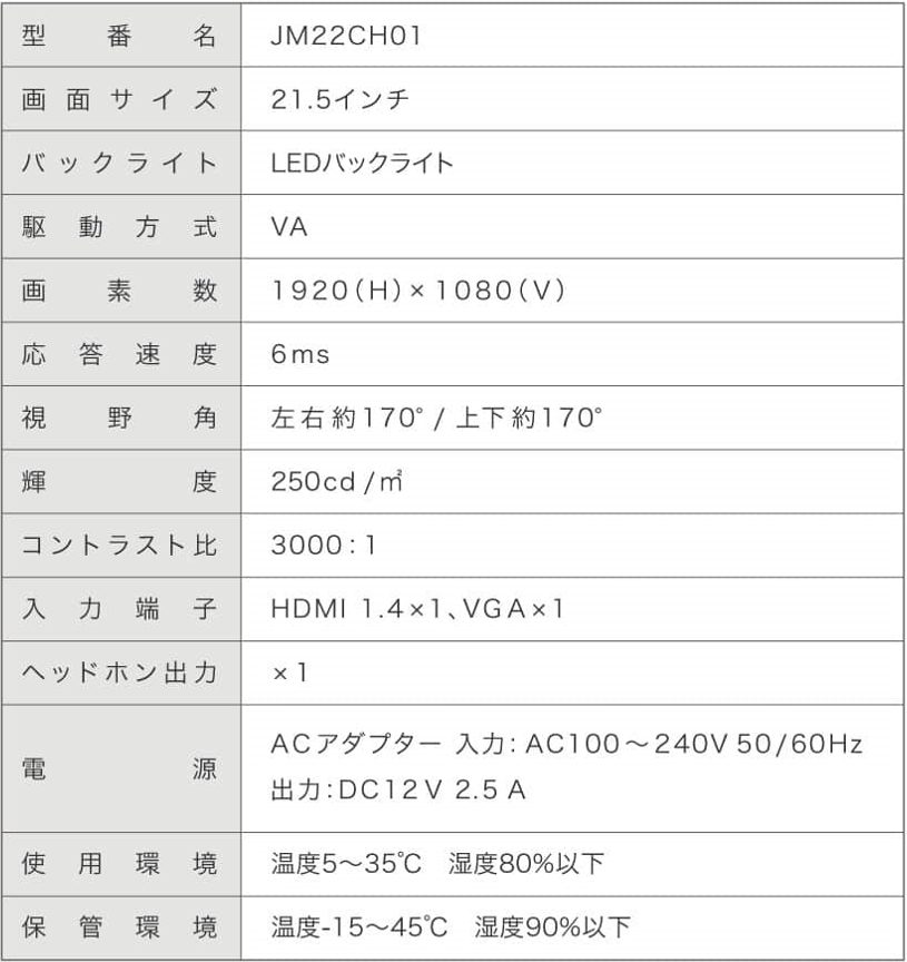 21.5インチ(JM22CH01)に搭載したVAパネルは、黒の黒さの再現性が高く、コントラストとメリハリのきいた映像を楽しめます。一般的にVAパネルは斜めから見た際に白っぽく見えるとされていますが、幅広の画面でも見やすいように上下左右170°の視野角で斜めから見た際も美しく見えるVAパネルを採用しました。
