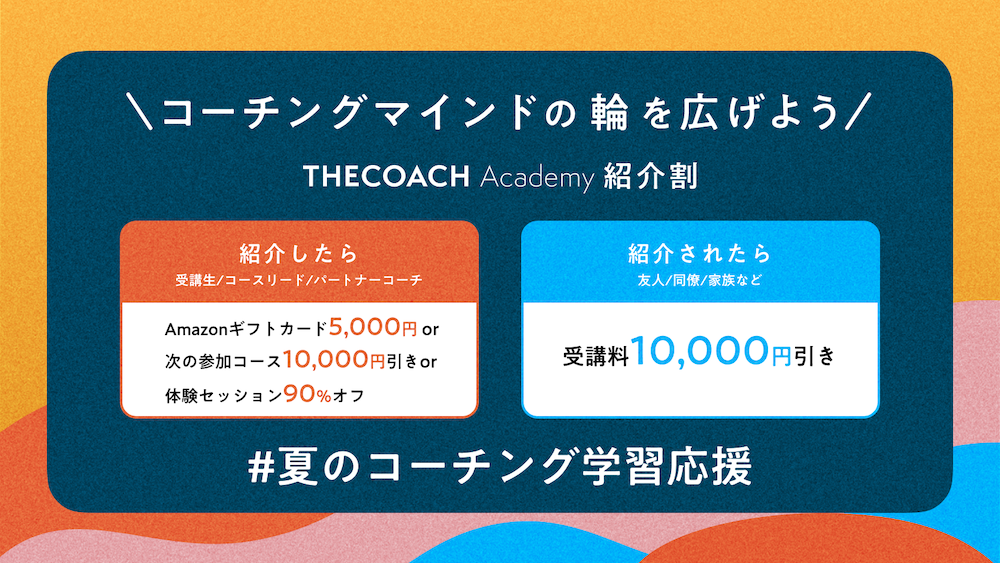 THE COACH Academyでは、コーチングマインドを広げることを目指し、お友達紹介特典を用意しています。受講生がご家族やご友人を紹介することで、双方に特典を提供するプログラムです。