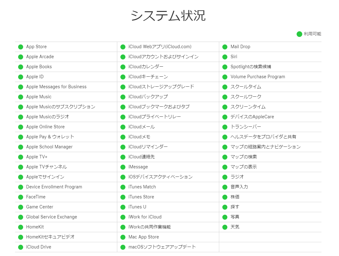Appleサーバーに不具合が起きているとiOSのアップデートが正常に完了できないことがあります。Appleサーバーの状況はAppleが提供するシステム状況が表示されるページから確認できます。