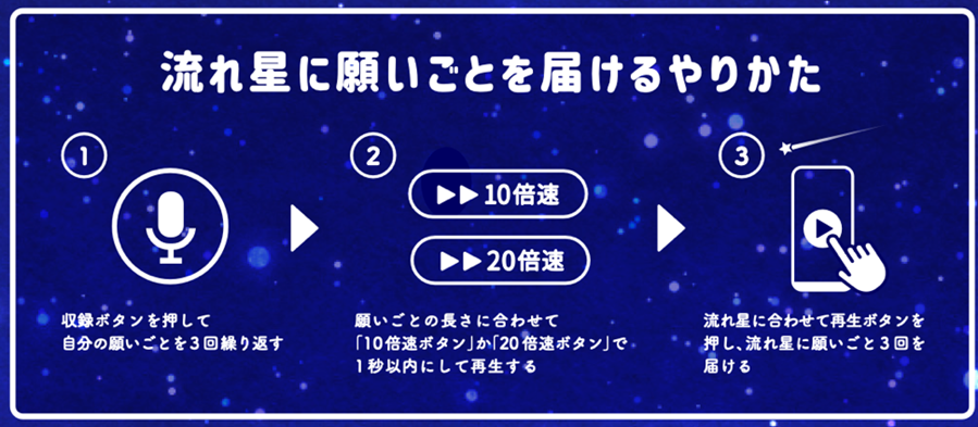 願いごとを3回唱えた音声を1秒以内で高速再生。瞬間的に消えていく流れ星に聞かせる、というもの。