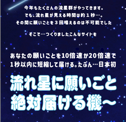 「流れ星にみんなの願いごと3回を届けることができる」、世界初!?の無料WEBサービスをローンチします。