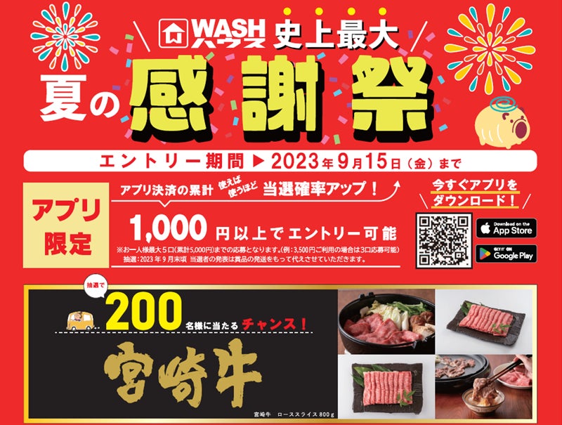コインランドリーWASHハウスでは、2023年9月15日(金)まで、WASHハウスアプリで累計1,000円以上