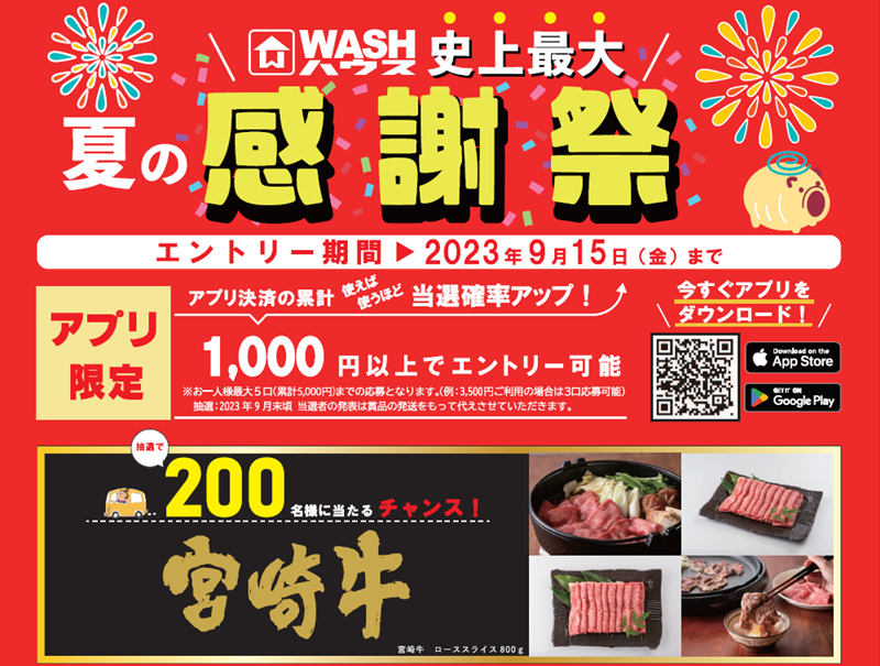 ・対象期間中、WASHハウスアプリで累計1000円以上決済すると、