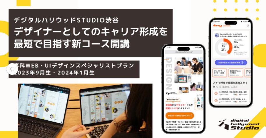 このたび開講する、未経験から最短距離でWeb・UIデザイナーを目指すことが可能な「Web・UIデザインスペシャリストプラン」では、Webデザイナーとしてのスキルに加えて、UIデザイナーとして専門的なスキルを学び、自身のキャリアやスキルを更に向上させ希望の就職・転職を目指します。