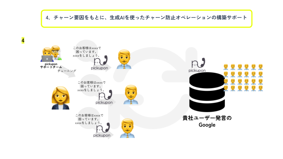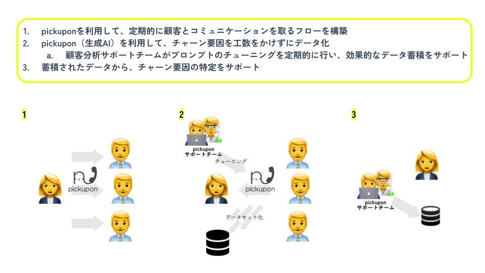 チャーン要因をもとにpickupon(生成AI)を利用したチャーン防止オペレーションの構築をサポートします。