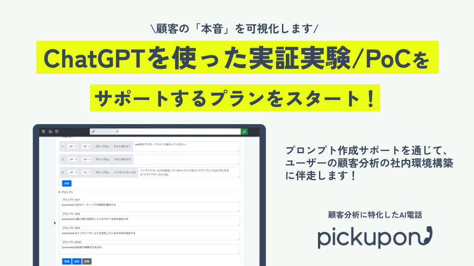 ChatGPTを使った電話シーンの実証実験 / PoCを目的とした「プロプラン(プロンプトエンジニアリングプラン)」※は、pickuponを利用するユーザーが生成AI (ChatGPT) を活用して独自のプロンプトを作成できるサービスです。これによりユーザー自らが顧客のインサイトやフィードバックの掘り起こしの鍵となる顧客の反応や感情の引き出しを行い、ニーズを即座に抽出することが可能になります。