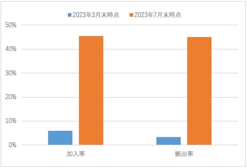 本施策開始後、対象者に対し社内説明会の開催等、加入促進を行った結果、2023年7月末時点で加入率45.39%、拠出率45.04%となり、本施策開始前と比較し、加入率が約7.6倍、拠出率は13.5倍となりました。