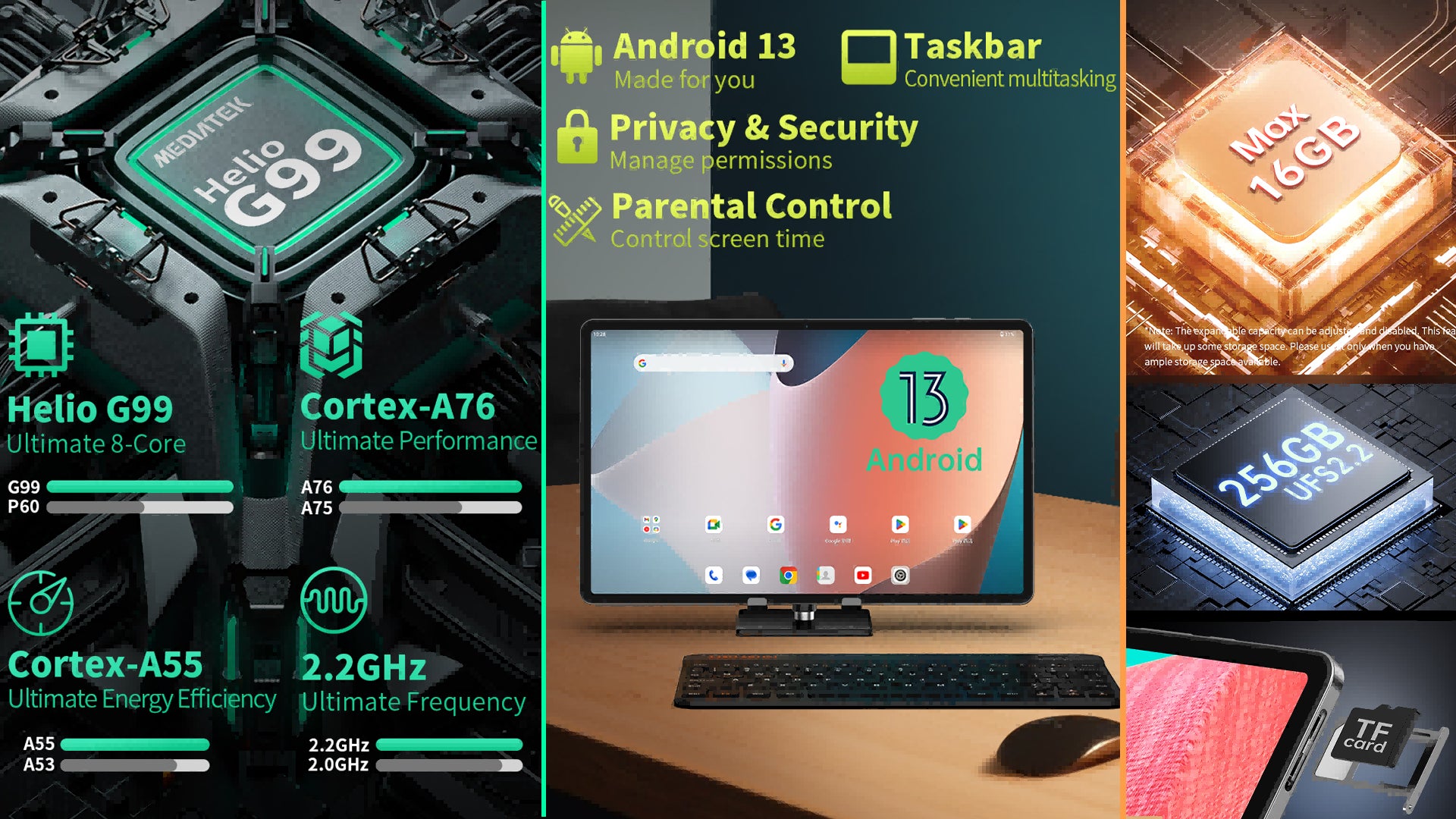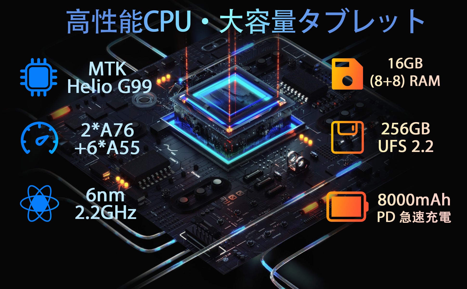 MTK Helio G99 8コア搭載 / 11インチ / Android 13 / 16GB LPDDR4+256GB / 2K FHD IPSディスプレイ / 8000mAh 18W PD快速充電 / 4モード衛星測位 / 4G LTE通話+WiFIモデル / 20MP+8MPカメラ