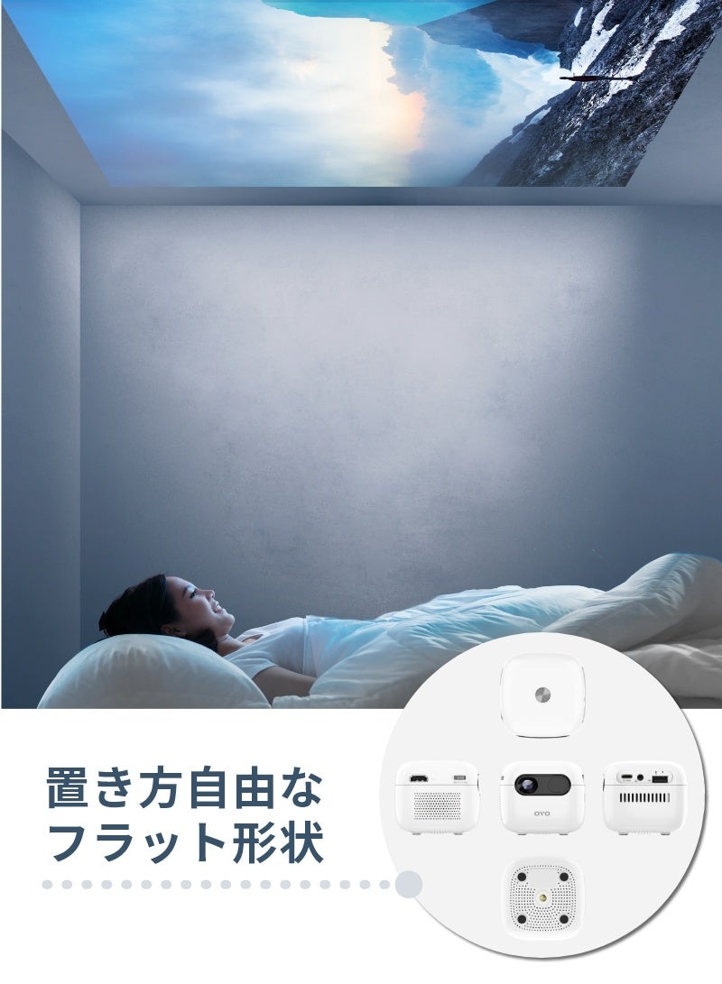 本体の背面に充電ポート等を設けていないフラットな形状の設計であるため、天井投影しリラックスしながら快適に楽しむことも可能です。
