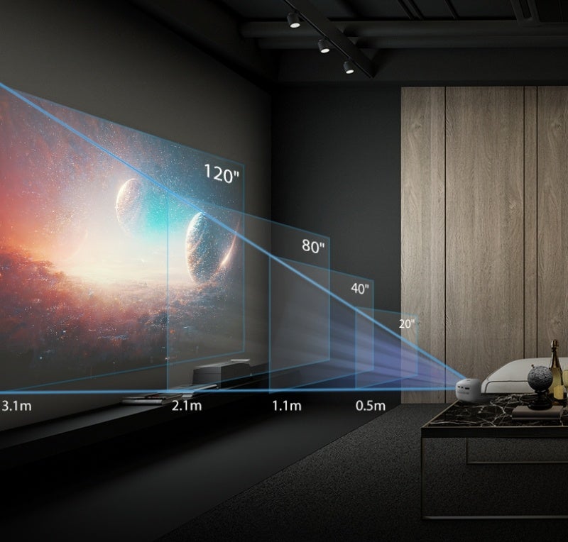 最小20インチ、最大120インチの大画面で投影することができるため、投影する空間の広さや人数にぴったりとアジャストして使用することができます。特に高解像度で投影されるU1は大人数でのミーティングや講義の他、映画やスポーツ観戦など、大人数で楽しむことができる娯楽の場面でも快適に使用することができ、大変重宝されます。
