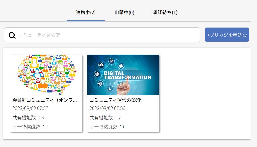 コミュニティで運営管理しているイベント、プロジェクト、施設、メンバー、動画をほかのコミュニティから連携申請することにより、承認されると連携ができるようになり、連携先に所属するメンバーが相互に情報を閲覧できるようになります。