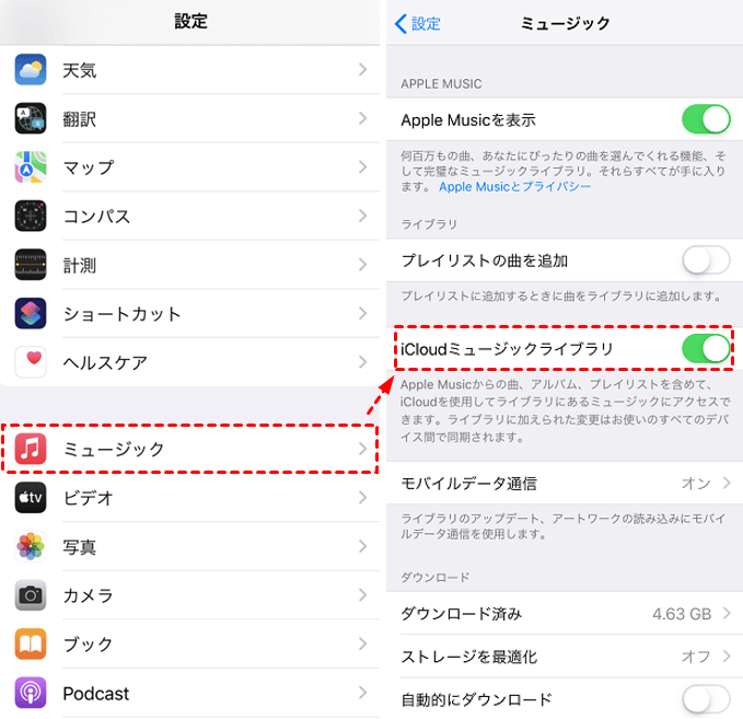 Step2.iPhoneで「設定」を開き、「ミュージック」に移動します。次に、「iCloudミュージックライブラリ」をオンに切り替えます。