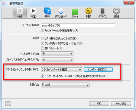 Step1.iTunesを開き、「編集」メニューから「設定」を選択し、その中で「CDをセットしたときの動作」が「CDのインポートを確認」に設定されていることを確認してください。