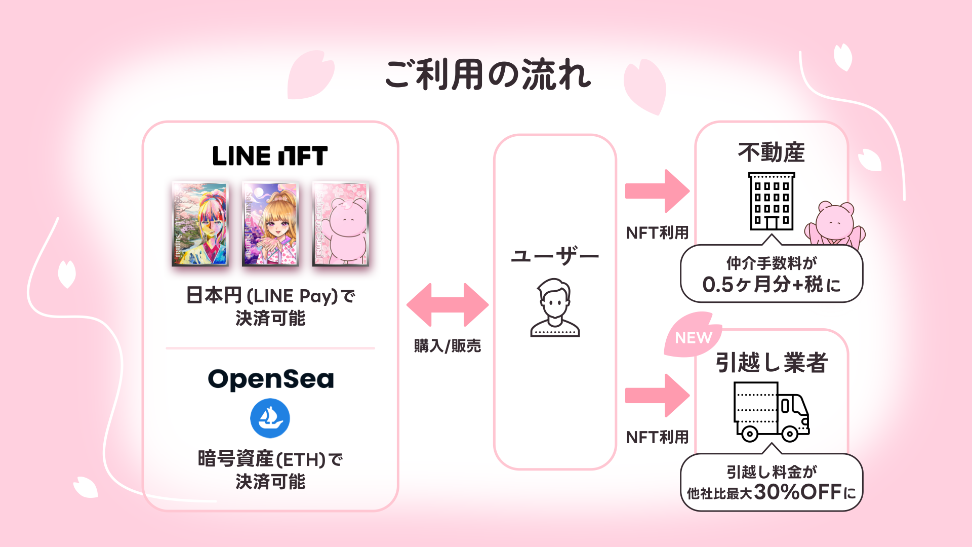①特定の取扱店で提示すると、賃貸仲介手数料が0.5ヶ月分+税になる会員権NFT